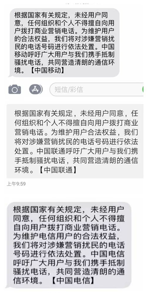 记者注意到,三家运营商短信内容基本一致。发送人号码为三大运营商官方客服号码。在短信中,运营商还呼吁广大用户携手抵制骚扰电话,共同营造清朗的通信环境。