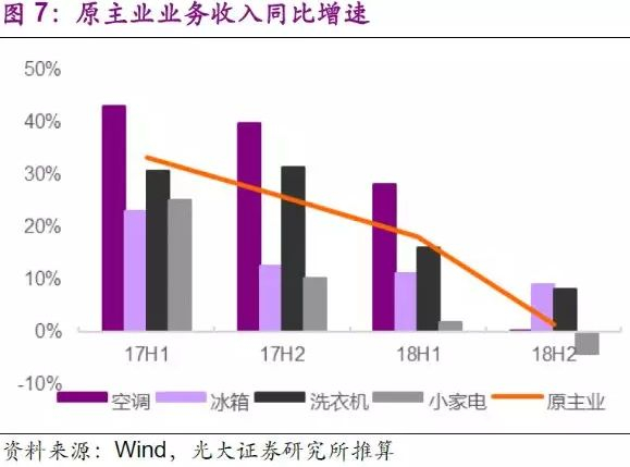 原主业里面,空调依然是扛把子。上半年增速27.7%,下半年仅微增0.4%。主要是中国空调市场去年下半年开始下滑。公司积极调整策略,今年一季度以性价比的战略抢占市场份额,并适当对渠道补库存。