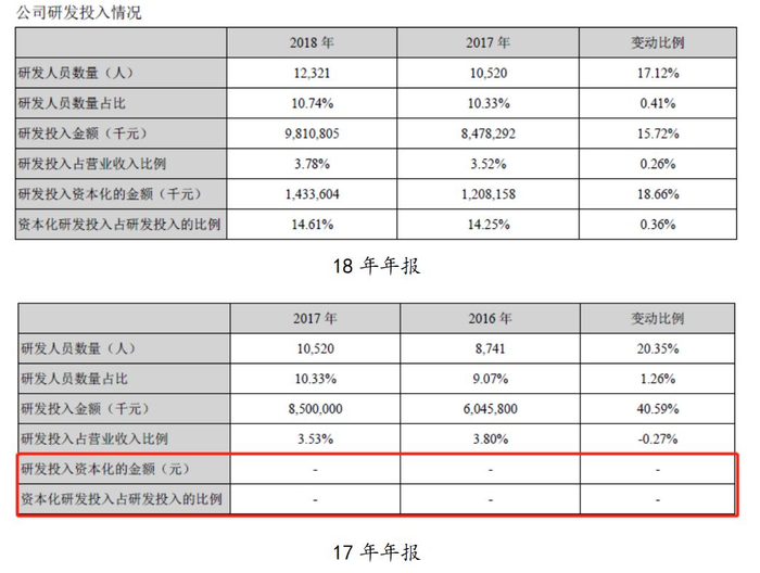 2. Q:18年研发98亿资本化14亿,17年研发85亿资本化12亿,但17年年报没有披露资本化,是什么原因?