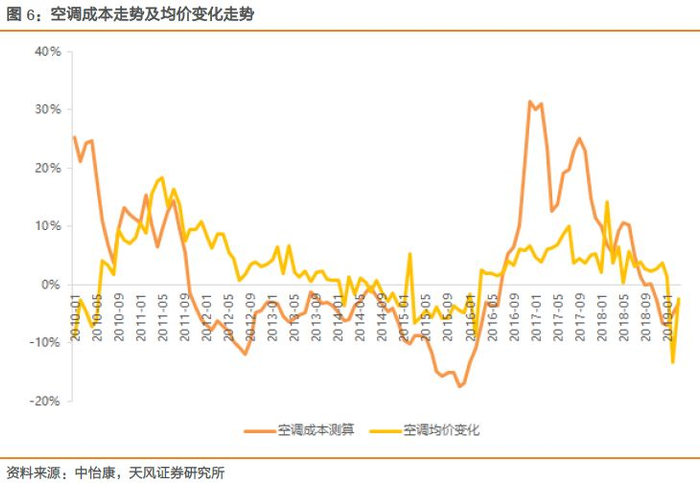 他们认为,在充分竞争的市场下,空调整机成本与空调均价走势具有相当程度的关联度。尽管存在消费升级及品类结构改善所带来的均价上升,但整体趋势上仍然会契合原材料价格的波动方向。因此,引起此轮空调价格下行的核心原因为成本下降。