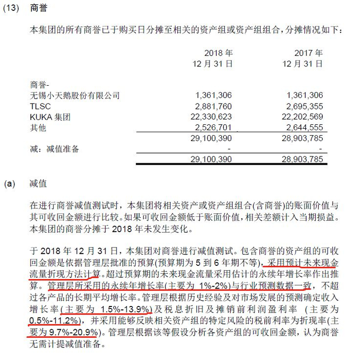 美的商誉主要来源于小天鹅、东芝(TLSC)、库卡集团。结合以上减值测试的关键假设一个个看: