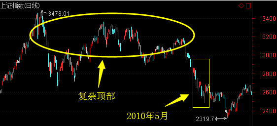 2010年5月,沪指下跌9.70%,直到7月才见到大波段底部。不过当时5月的下跌,发生在沪指长达8个月的复杂顶部出现之后。