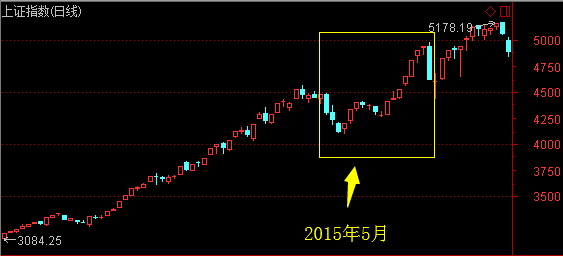 2015年5月,经过月初3天的大幅调整后,沪指最低见到4099点,随后便开始了牛市最后的疯狂,最高涨到了6月的5178点,一共上涨了1079点。