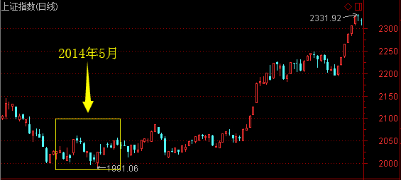2014年5月,沪指低位整理,期间波动幅度仅仅只有70点,振幅仅仅只有3.45%,随后在7月迎来了牛市的开启。