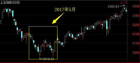 2017年,沪指从“五一”劳动节前的4月中旬开始杀跌,并在5月11日见到波段底部,随后形成双底。接下来沪指从3016点附近,上涨到8月的3305点附近,一共上涨了289点。