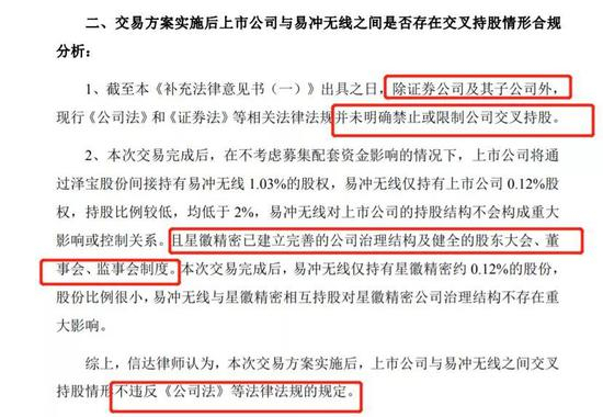 2、2018年7月,星徽精密公告15.3亿收购跨境电商泽宝股份,收购完成后,公司将持有泽宝股份100%股权,泽宝股份持有易冲无线1.03%股权,易冲无线持有泽宝股份0.3746%的股份。在不考虑募集配套资金实施的情况下,交易方案实施后,易冲无线将持有上市公司39.4万股,持股比例为0.12%,而上市公司将通过泽宝股份间接持有易冲无线1.03%的股权,存在交叉持股情形。