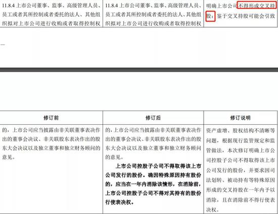 其中最重要的部分是对于交叉持股有了明确规则限制,比如深交所《上市规则》第11.8.4条和《创业板上市规则》第11.8.5条分别增加一款,作为第二款:“上市公司控股子公司不得取得该上市公司发行的股份。确因特殊原因持有股份的,应当在一年内消除该情形,在消除前,上市公司控股子公司不得对其持有的股份行使表决权。”