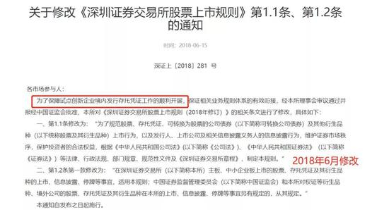 2018年6月,为了保障试点创新企业境内发行存托凭证,对《上市规则》进行了修改。