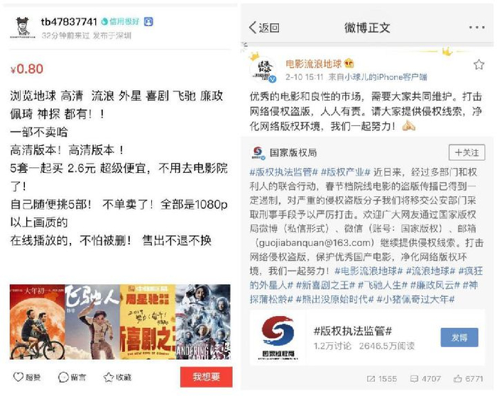 片源流失的问题,不是《流浪地球》一部电影所遇到的,实际上只要有热度的作品,都会遇到。作品的收益是社会对作品的一种肯定,是影视工作者创作好作品的动力来源和物质保障。盗版、非法传播的行为其实是在砸认真工作的创作者的饭碗,好作品的创作者不能从作品中受益,影视创作良性循环就会被打破。因此,我们首先要感谢公安机关和有关部门卓有成效的工作,有力打击了侵权行为,震慑了违法犯罪分子;其次我觉得真正要解决这方面问题,仅仅依靠公安机关是不够的,还需要我们所有人加强知识产权保护意识,需要整个社会的共同努力。