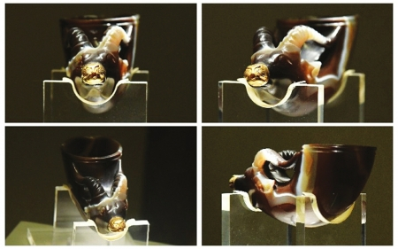 雕刻师匠心独运,将玛瑙粗端雕琢成杯口,细端雕琢成兽首。兽首双眼圆睁,目视前方。两只兽角粗壮有力,连接着杯身两端,成为玛瑙杯的把手。兽嘴部分用黄金制成金帽塞子,卸下金帽,杯中琼浆即可自流泄出;兽的双唇闭合,两鼻鼓起,就连其唇上的毛孔、胡髭也刻画得细微精确。金色的兽嘴与整体暗红的玛瑙形成反差,弥补了玛瑙色泽偏暗的不足,巧妙的设计透露着强烈的艺术气息。