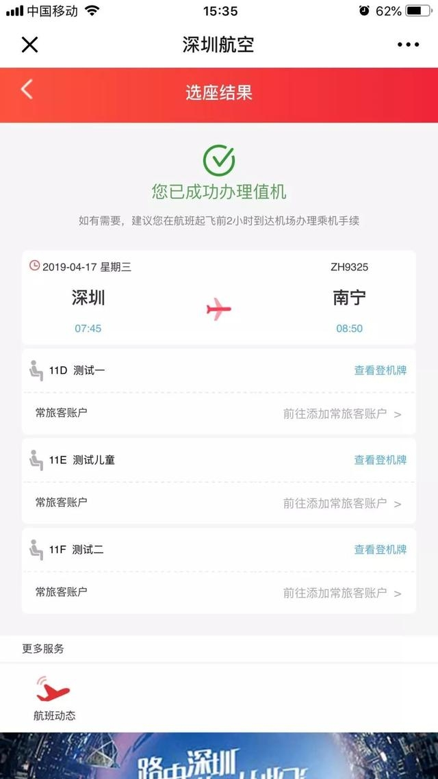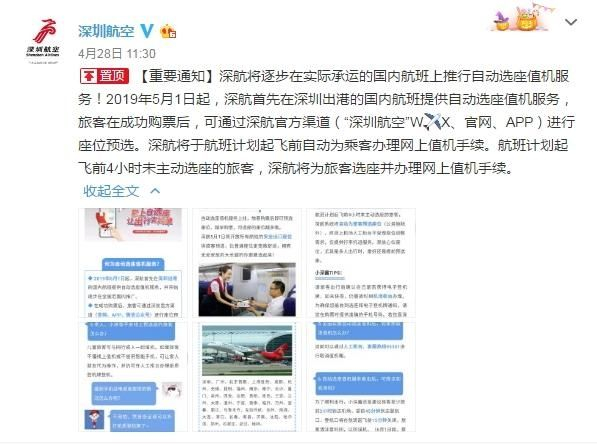 2019年5月1日起,深航首先在深圳出港的国内航班提供自动选座值机服务,并开始逐步在全国范围内推广。