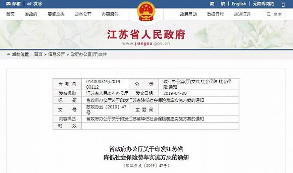 江苏省政府网站公布《江苏省降低社会保险费率实施方案》