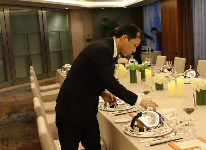 重要会议晚宴开始前,宴会服务经理陈雷作最后的细节确认。(供图)