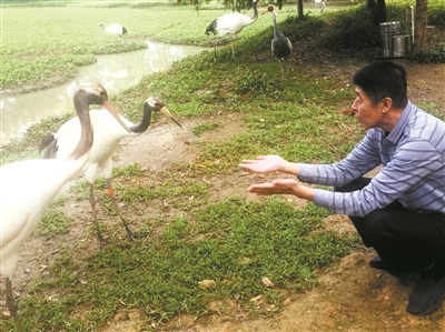 王杰戴着一顶白色的草帽,工作服上还黏着几根鹤毛。王杰走进鹤园,嘴中发出“咕咕咕”的声音,丹顶鹤们好像都认识他似的,纷纷围上来和他“打招呼”。王杰说,这是他和丹顶鹤之间独特的语言。召唤“鹤宝宝”们进食、回巢,也都有特殊的暗号。