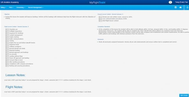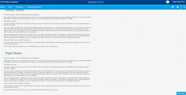 图:USAA航校Y颜洋的飞行记录之一。在整个私照第一阶段学习过程中,指标是S(满意)、评语很好,可以参加考核。文件截图由王湉提供