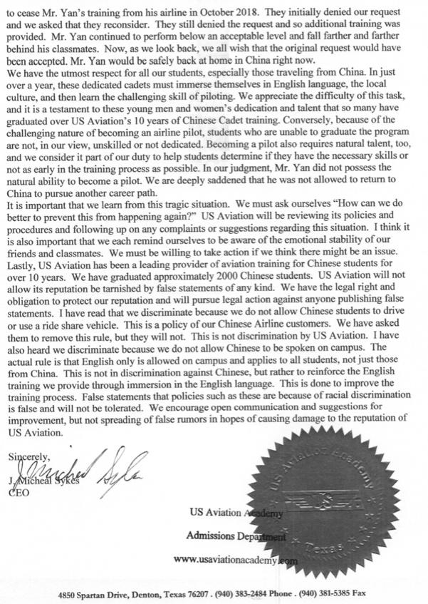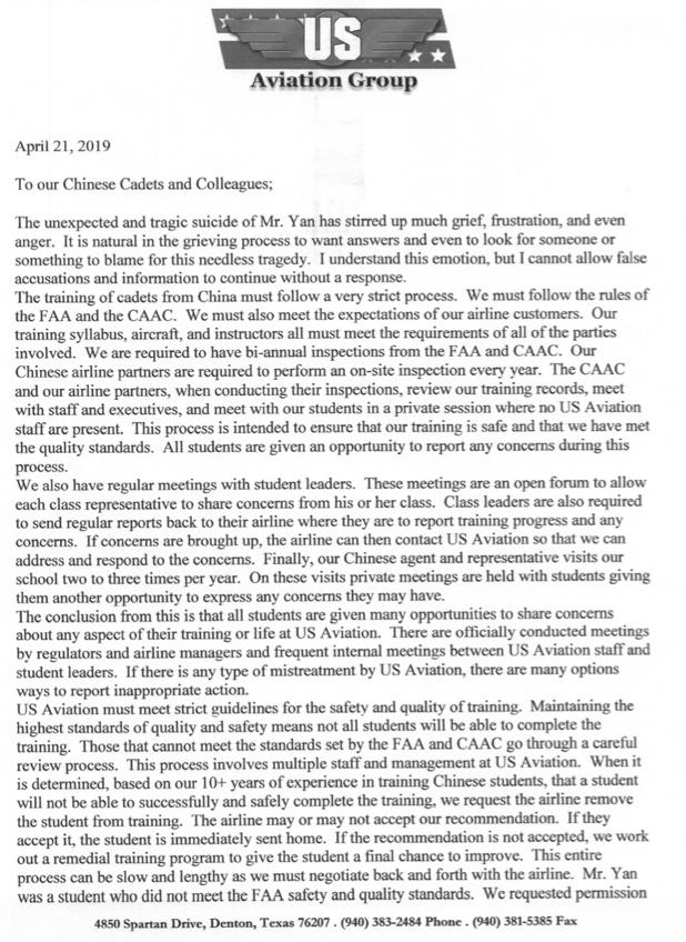图:USAA航校中国学生颜洋自杀后,校方发出的声明。文件截图由王湉提供