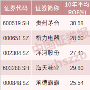 Wind数据显示,在2009年至2019年10年时间内,净资产收益率ROE(扣除/摊薄)连续超过20%的上市公司,A股仅有5家上市公司,分别是贵州茅台、海天味业、格力电器、洋河股份、承德露露。