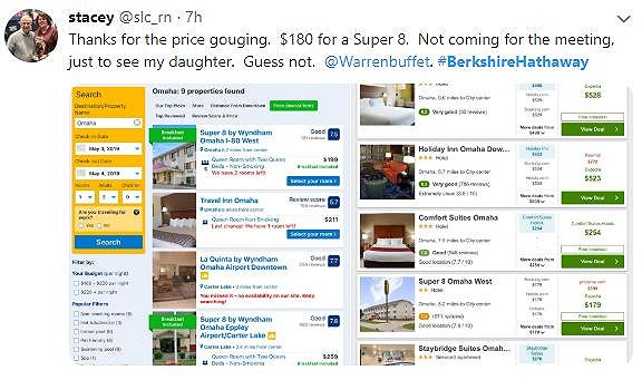 巴菲特曾在2017年伯克希尔股东信中,建议股东住在车程90分钟之外的堪萨斯城,可以节省住宿和机票费用。有美国网友发现,股东大会周末,奥马哈最廉价的Super 8汽车旅馆一晚上收费180美元,而股东大会结束后的周末直接降至80美元。