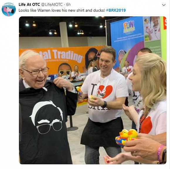 巴菲特今天也收下了Q版小黄鸭,还拿走一件印有他Q版头像的T恤衫。