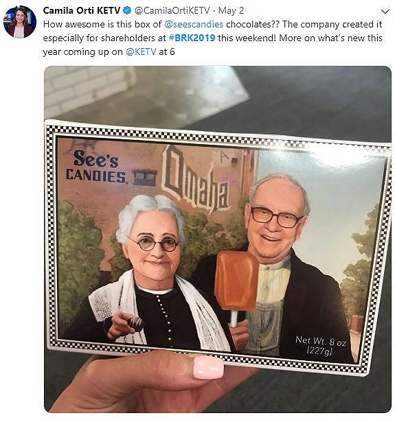 还馋?来一盒巴菲特“初恋的味道”喜诗糖果(See’s Candy),据称巴菲特去拜访初恋女友家时送了喜诗糖果,芒格总是在股东大会当天大嚼花生脆(peanut brittle)。今年的股东大会推出了巴菲特与喜诗糖果创始人奶奶的卡通形象纪念封面,华尔街见闻的经验是,这种有特殊意义的糖果包装周六大会结束前将被抢光。