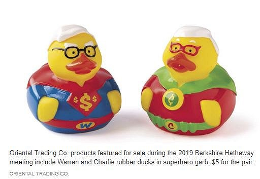 想收藏Q版巴菲特玩具?别错过Oriental Trading(东方贸易公司)的展柜。这家奥马哈本地的家庭装饰产品、玩具和纪念品零售商,于2012年被伯克希尔收购,已经连续七年出售股东大会纪念版的“小黄鸭”玩偶。今年的主题是“超人”,巴菲特和芒格幻化的橡皮鸭将穿上斗篷、胸前戴着象征金钱的符号,与“复联”系列小黄鸭们一起等待被你收入囊中,一对仅5美元!