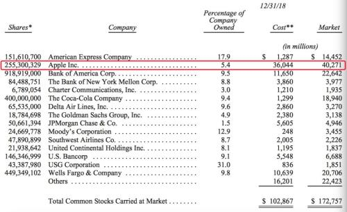 今年2月公布的年度致股东信中披露,截至2018年底,伯克希尔·哈撒韦的15大重仓股中,苹果以402亿美元位居第一。