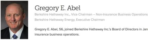 格雷格·亚伯目前是伯克希尔·哈撒韦能源公司(Berkshire Hathaway Energy)的董事长兼CEO。2018年1月,被提拔为主管伯克希尔·哈撒韦非保险业务的副董事长,处理公司的日常事务。