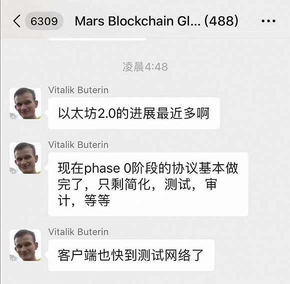 但那次大会之后三个月,以太坊价格再度暴跌,他的地位也随之不保。2019年3月,火星财经创始人王峰发了一条朋友圈状态,截图中俄罗斯人V神在群里打出流利的中文,报告以太坊2.0的地基快要打好了,然而回应者寥寥。