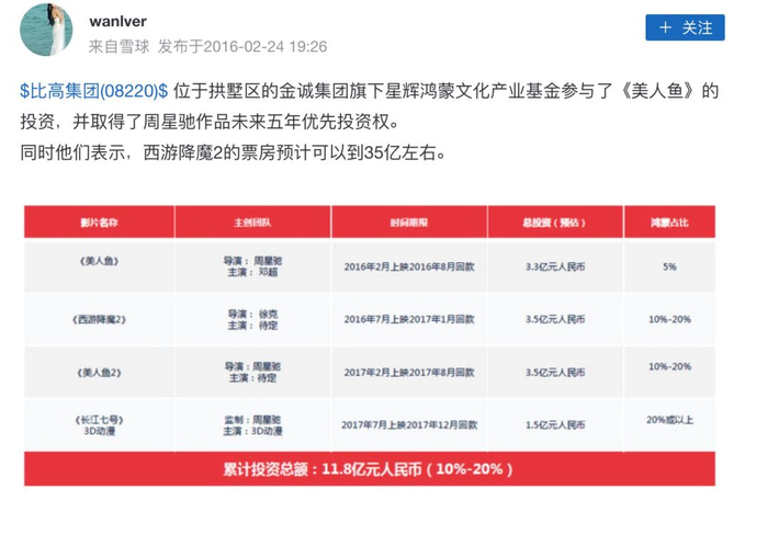 1、参与了《美人鱼》的投资,并取得了周星驰作品未来五年优先投资权