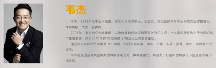 官网显示,出生于1981年的韦杰毕业于浙江大学法学专业,在创立金诚集团之前,是一名执业律师,经历了7年的律师生涯后,毅然决然投身于商海。