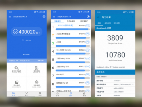 为了更加直观地让大家了解红魔3的性能表现,按照惯例,我们还是首先来看下这款红魔3在跑分上的表现。笔者手中的为8+128GB版,选用的是当前主流的性能评测软件安兔兔和Geekbench 4来进行测试。根据测试结果来看,该机安兔兔跑分得分400020分,Geekbench 4单核得分3809,多核得分10780,均远远超过了其他对手,并刷新了目前安卓手机跑分的记录,性能实力可见一斑。