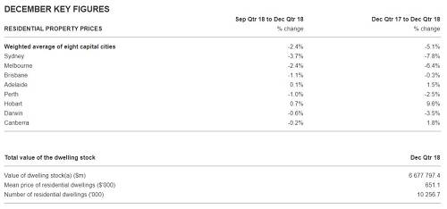 2018年第四季度,澳大利亚住宅物业总存量增加了42600套,而同期房屋平均价格(总价)下跌了1.5万澳元-65万澳元。