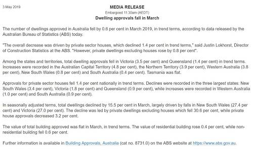 澳大利亚统计局数据显示,2019年3月该国获批建设的住房量下降了0.6%