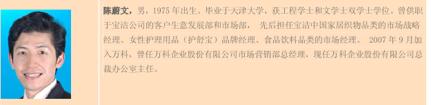 2006年,以人力资源顾问马克和工厂化住宅建筑技术总监伏见文明空降万科为标志,万科开始人才国际化。从2007年开始万科招入第一届国际化“新动力”,在全球范围内招揽优秀人才。当时陈蔚文担任宝洁(大中华区)市场部经理,聘请到万科集团产品品类部总经理。这次行动号称万科的“007行动”,把目标瞄准了具有当时最先进管理模式的制造业及零售业界的高级管理人才,除了陈蔚文,万科的名单里还有这些人:陈东锋(原宝洁公司信息与决策解决方案部总监)、袁伯银(原百安居中国区执行副总裁)、许国鸿(原仲量联行亚太区董事、资产管理总监)、于玉光(原万博宣伟公关公司消费品及医疗领域领导人)。