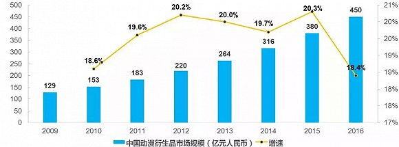 报告显示,2009-2016年,中国动漫衍生品市场规模增长2.5倍,2016年达到450亿元人民币,年均增长速度接近20%。参考美国、日本、韩国等成熟动漫市场,动漫产业70%以上的利润是通过动漫衍生品研发、销售以及动漫形象授权等实现的,但是我国的衍生品业务还处在起步阶段,并未形成成熟的衍生品业务链。