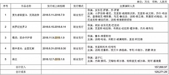 发行业务营收高达49.77亿元。其中,排名前五的发行作品共实现15.79亿元收入,扣除成本后获利2.8亿元。且均为海外引进,包括《复仇者联盟3》、《毒液》《碟中谍6》等。