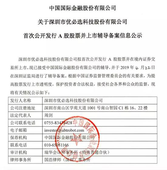 5月6日,深圳证监局公示的信息显示,深圳市优必选科技股份有限公司拟A股IPO,现正在接受中金公司辅导,2019年4月22日已在深圳证监局辅导备案。
