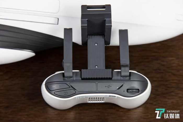 本次我们收到的套装中,拥有一个独立遥控器,这个遥控器也是需要搭配手机连接APP进行操作。遥控器中间有一个可调节手机固定架,可以加装不同大小的智能手机,内部有C、N、U三挡模式调节拨杆,顶部为可收纳独立天线。