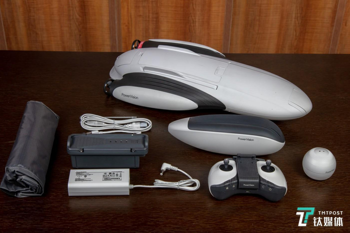 本次,钛媒体收到的是臻迪PowerDolphin小海豚套装。该套装包括PowerDolphin无人机主体、独立遥控器、智能电池/充电组、打窝装置以及PowerSeeker智能寻鱼器。