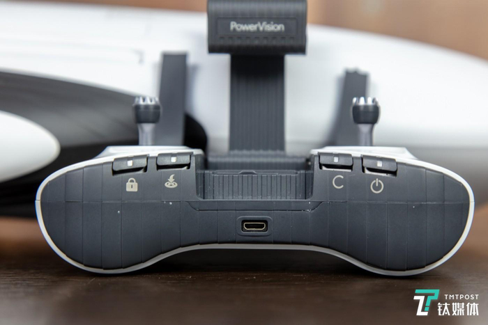 遥控器底部有四个独立功能按键,从左至右依次为动力锁定、自动返航、定速巡航以及电源开关。中间的Micro USB为遥控器独立充电接口,其内置3500 mAh电池,最大工作时间为2小时。