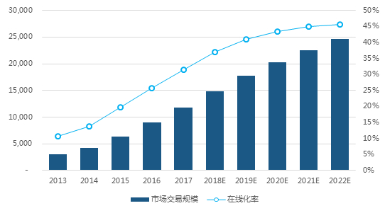 随着旅游在线服务、网络营销、网上预订、网上支付等业务的迅速展开,在线旅游火速增长。艾瑞咨询的数据显示,2017年中国在线旅游市场交易规模达11725.9亿元,预测到了2022年将高达24621.4亿元。旅游的在线化率也在逐渐攀升,从2013年的10.6%飙升至2019年的预估40.9%。