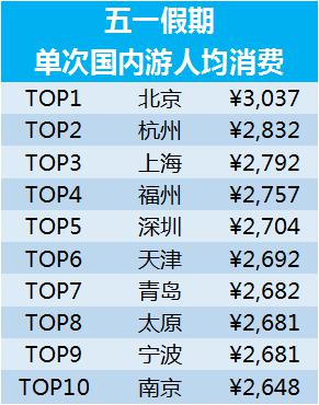 随着社会经济发展水平的提高,国民旅游消费也在迅速提高。根据携程跟团游和自由行数据,五一假期“国内游消费力前十强城市”依次为北京、杭州、上海、福州、深圳、天津、青岛、太原、宁波和南京。这些城市五一旅游单次国内游人均花费超过2600元,其中北京高达3037元。