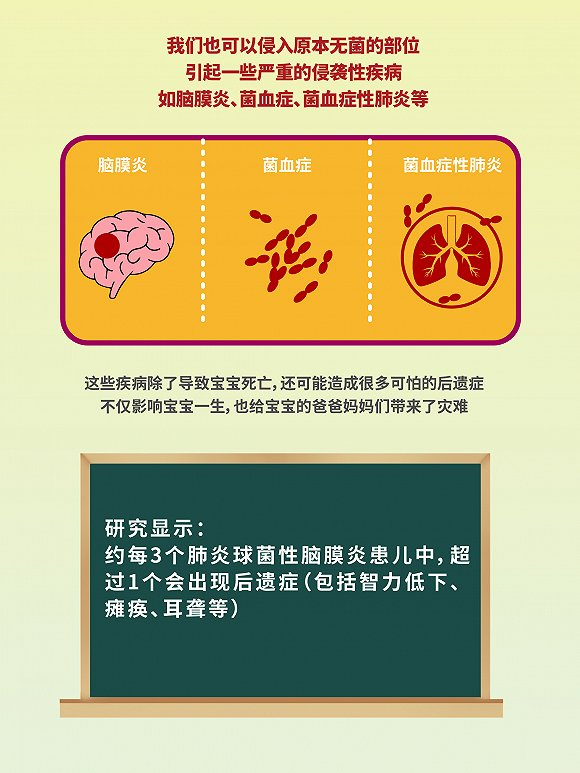 根据中华预防医学会发布的《肺炎链球菌性疾病相关疫苗应用技术指南》,肺炎球菌是一种可引发儿童重症感染最常见的细菌,广泛定植于人类鼻咽部,发达国家健康儿童携带率为27%,发展中国家为85%。肺炎球菌可入侵身体多个不同部位,导致支气管炎、中耳炎、鼻窦炎、肺炎、败血症甚至脑膜炎,严重时可导致耳聋、瘫痪、智力低下等后遗症,肺炎球菌所致脑膜炎的主要后遗症如智力低下的平均发生风险为24.7%。