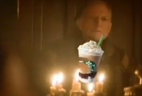 中世纪的宴会木桌,跟象征现代社会的星巴克咖啡同处一框,让网友忍不住开始吐槽。
