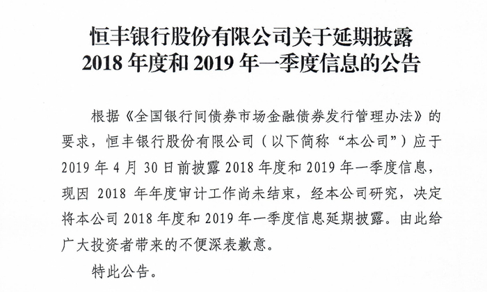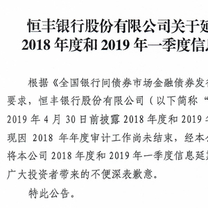 4月30日是年报披露最后截止日,12家全国性股份制商业银行中,恒丰银行至今未披露2018年年报及2019年度一季报。根据恒丰银行4月30日发布的公告,该行因2018年年度审计工作尚未结束,决定延期披露2018年度和2019年一季度信息。