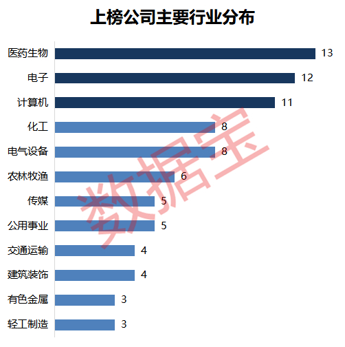 所属行业方面,上榜公司中医药生物、电子、计算机等新兴行业最为集中,均有超10家公司上榜,医药生物行业上榜公司数量最多,有13家。板块分布显示,上榜公司中,中小板、创业板分别有32家、25家,合计占比近六成。