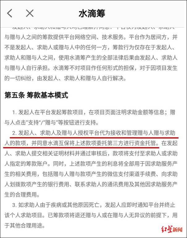 对于该猜测,记者浏览水滴筹的《用户协议》中发现,有一条为“发起人、求助人及赠与人授权平台代为接收和管理赠与人赠与求助人的款项,并同意水滴互保将上述款项委托第三方进行资金托管。”
