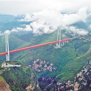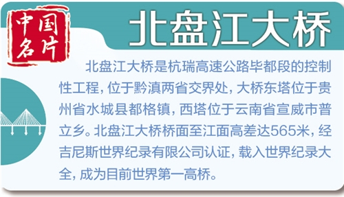北盘江大桥,长1341.4米,桥面至枯水期水面的高度差达565米,接近上海中心大厦的主体高度,位居世界之首;大桥东、西两个主桥墩高度分别为269米和247米;主桥为七跨连续钢桁梁斜拉桥,跨径达720米,目前在世界同类型桥梁中排名第二。有外国网友在观看北盘江大桥的视频后留言说,“中国用超级工程证明自己”。