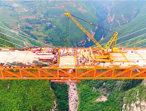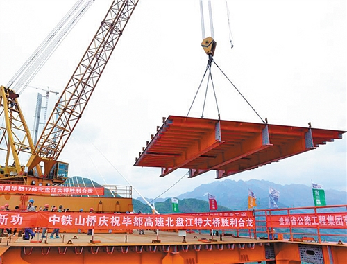 周平介绍说,北盘江大桥从开始修建直至合龙,取得了5大创新成果,包括“纵移悬拼”新工法、钢桁梁整节段梁底轨道纵移悬拼、“中纵梁+次横梁”梁板新型结构体系、山区峡谷自然风场非平稳数学模型和山区大跨径桥梁车辆行驶安全性及驾乘舒适性的评价准则、斜拉索凝冻监测等新型健康监测系统,