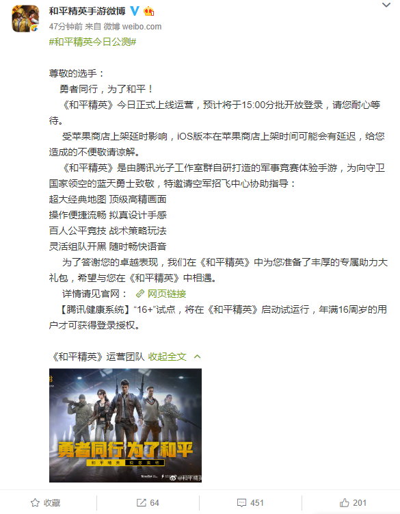而今日,和平精英官微也发布公告称,游戏正式公测,预计将于15:00分批开放登录。